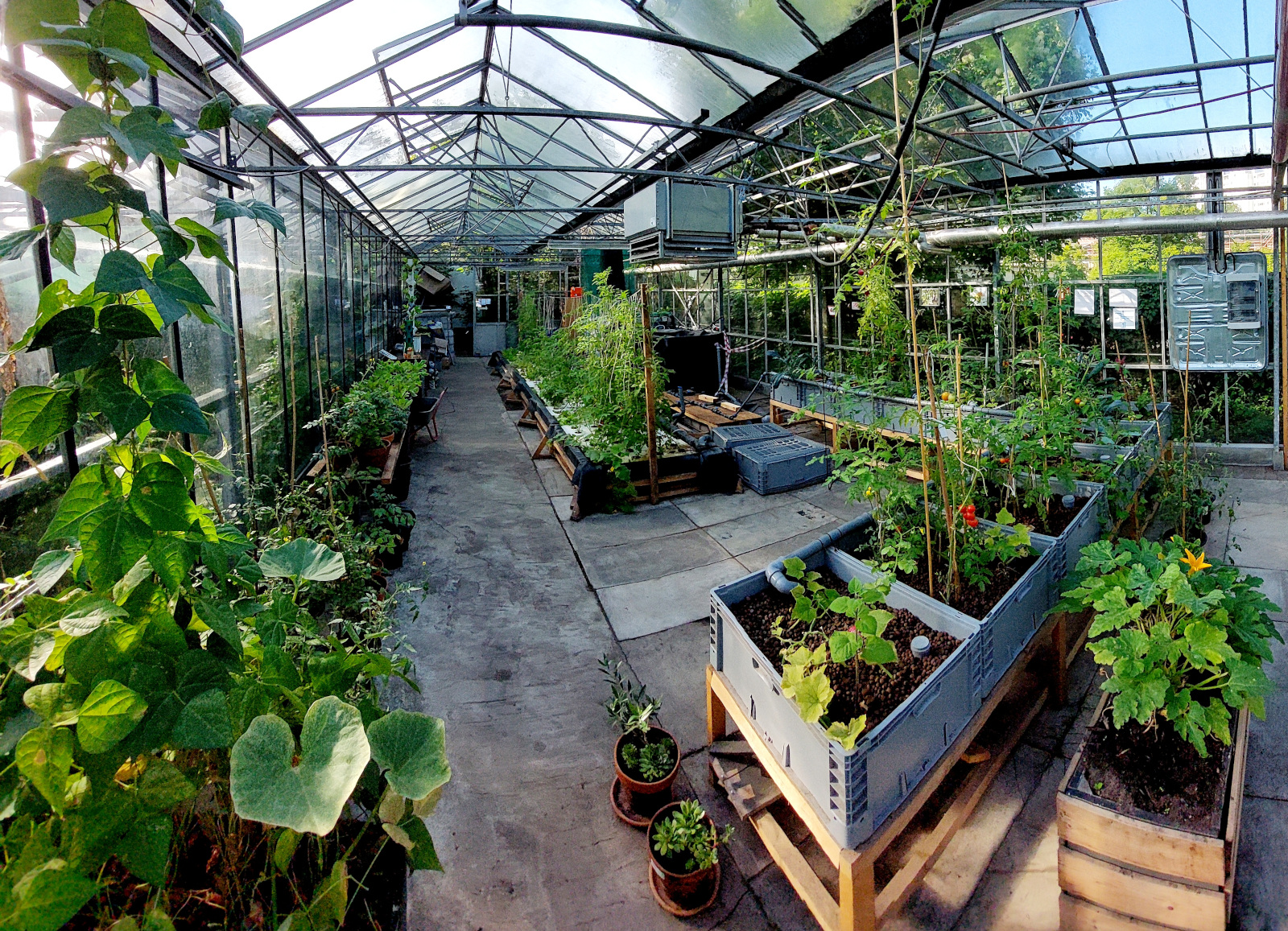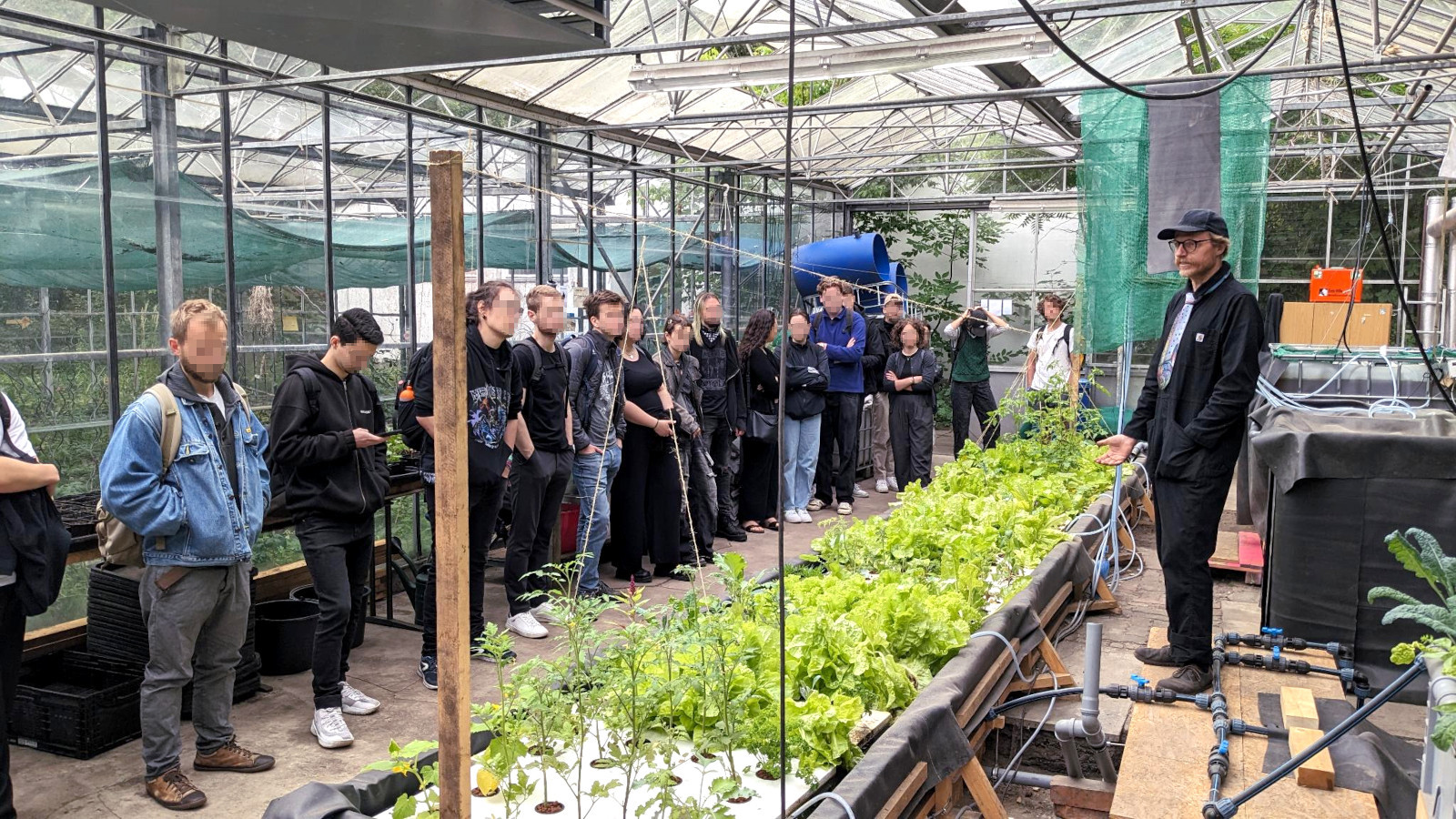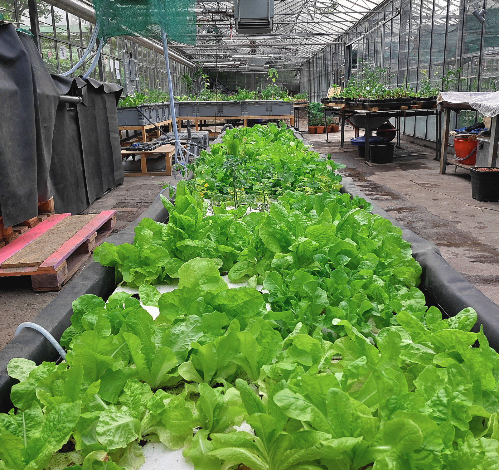 Unser Aquaponik-Prototyp läuft im ersten Testjahr auf ca. 100 m². Ca. 120 Nilbuntbarsche (Oreochromis Niloticus) düngen Salat, Tomaten, Gurken, Kräuter und vieles mehr. Ein selbst entwickeltes IoT-System mit Sensoren liefert Daten. Das Verhältnis zwischen Fischmasse und Pflanzenmasse ist noch nicht optimal, weil wir erst mal mit wenigen Fischen anfangen wollten. Deshalb haben die Pflanzen noch Mangelerscheinungen. Auch der pH-Wert konnte erst vor kurzem von 8.0. auf 7.2 gesenkt werden, da wir erst jetzt Regenwasser nutzen konnten. Dadurch werden Nährstoffe jetzt besser aufgenommen und die Pflanzen erholen sich. Über Schädlinge und umweltfreundliche Gegenmaßnahmen lernen wir gerade viel. Wir wollen uns langsam herantasten und Erfahrungen sammeln. Unsere Lernkurve ist steil und nächstes Jahr wollen wir einiges anders und besser machen.